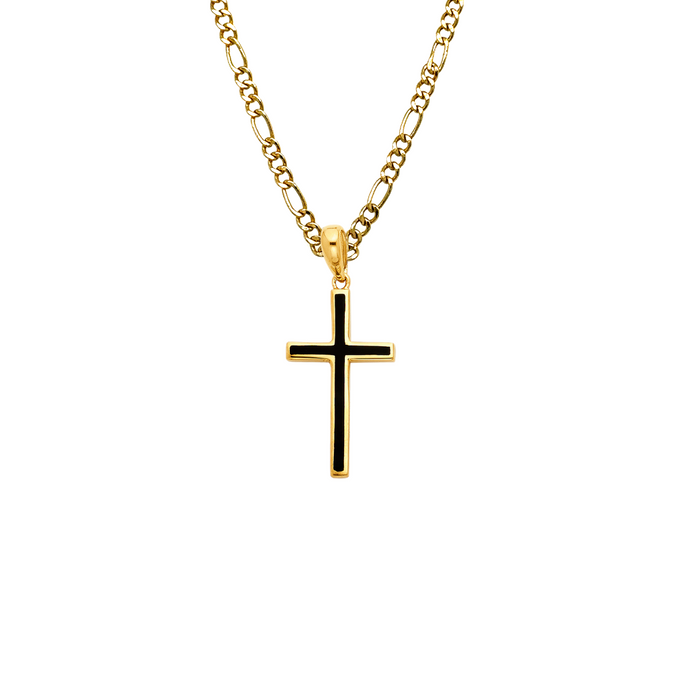 14k Gold Black Enamel Cross Pendant with choice of Solid Figaro or Valentino Chain