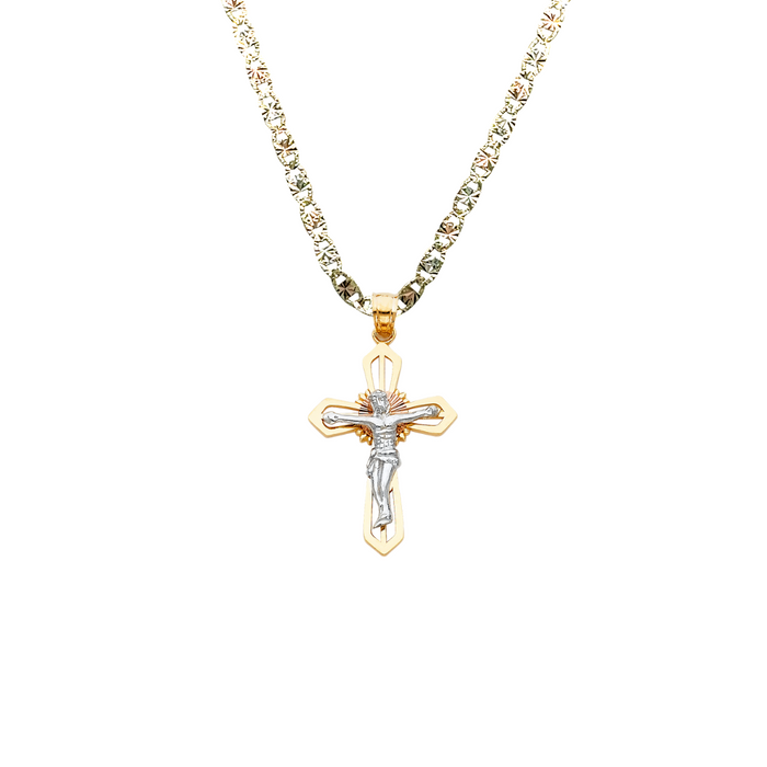 14k Two Tone Gold Jesus Cross Pendant with choice of Solid Figaro or Valentino Chain
