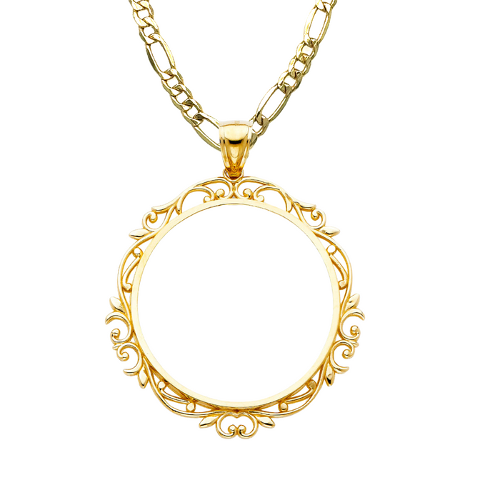 14k Gold Centenario Ornate Design Bezel with Solid Figaro Chain - LE-2064
