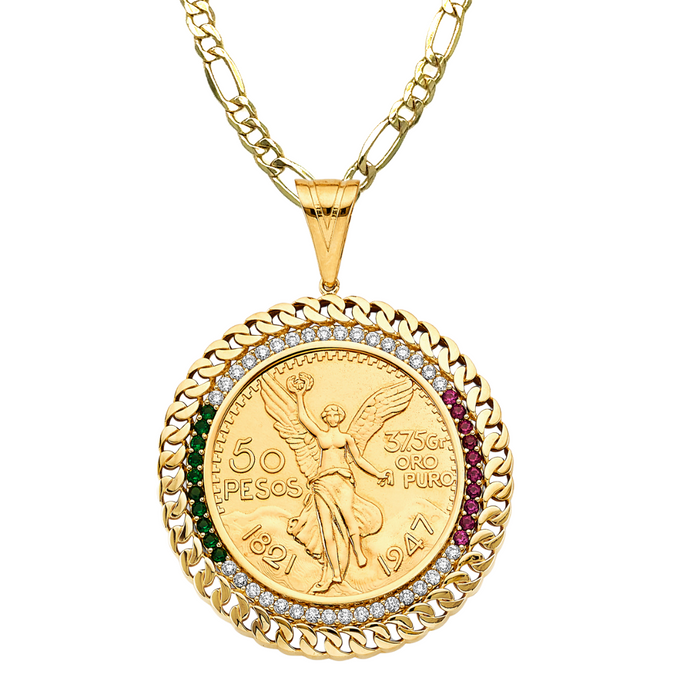 14k Gold Coin Centenario Design Gemstone Bezel with Solid Figaro Chain - LE-2757