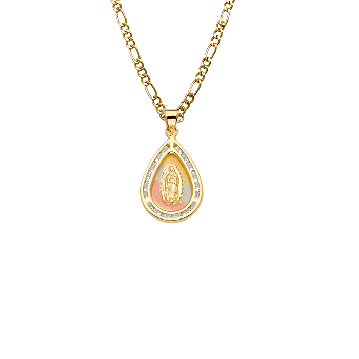14k Virgin Mary Tear Drop Gold Pendant with Gemstones and choice of Solid Figaro or Valentino Chain
