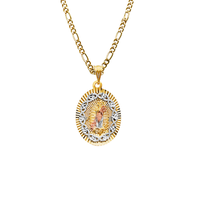 14k Virgin Mary Oval Diamond Cut Pendant with Solid Figaro Chain - LE-3201