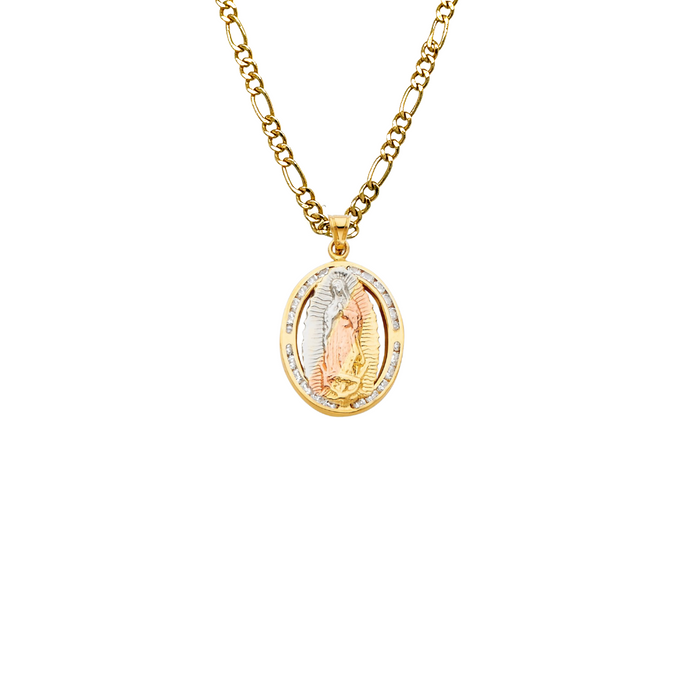 14k Virgin Mary Oval Gold Pendant with Gemstones and choice of Solid Figaro or Valentino Chain