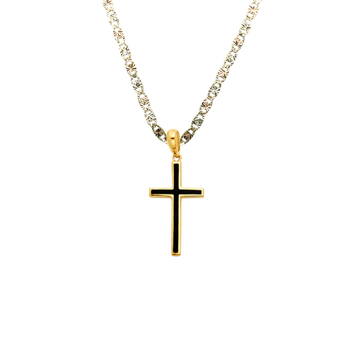14k Gold Black Enamel Cross Pendant with choice of Solid Figaro or Valentino Chain