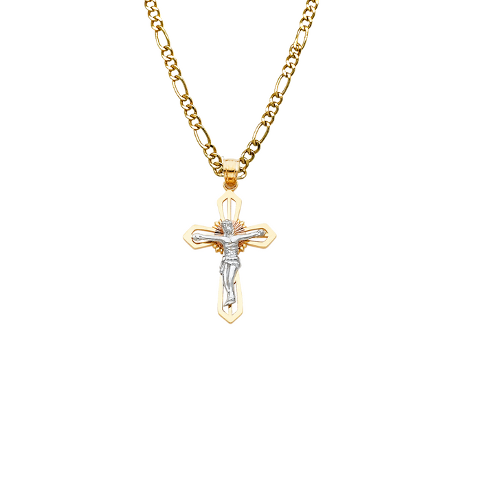 14k Two Tone Gold Jesus Cross Pendant with choice of Solid Figaro or Valentino Chain
