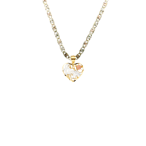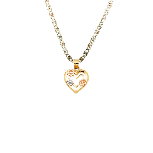 View full details14k Flowers Heart Tri-Gold Pendant and choice of Solid Figaro or Valentino Chain Product Details: Guaranteed 14 Karat Solid Gold Pendant and Soli...
