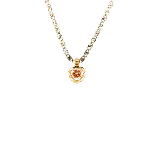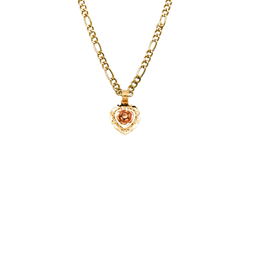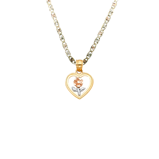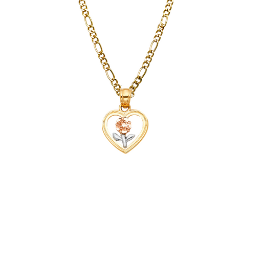 View full details14k Flower Heart Tri-Gold Pendant and choice of Solid Figaro or Valentino Chain Product Details: Guaranteed 14 Karat Solid Gold Pendant and Solid...