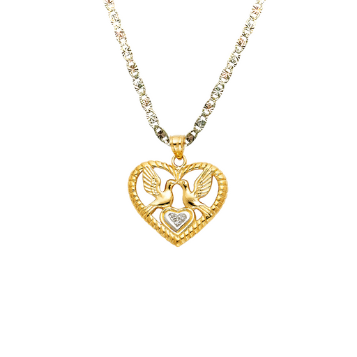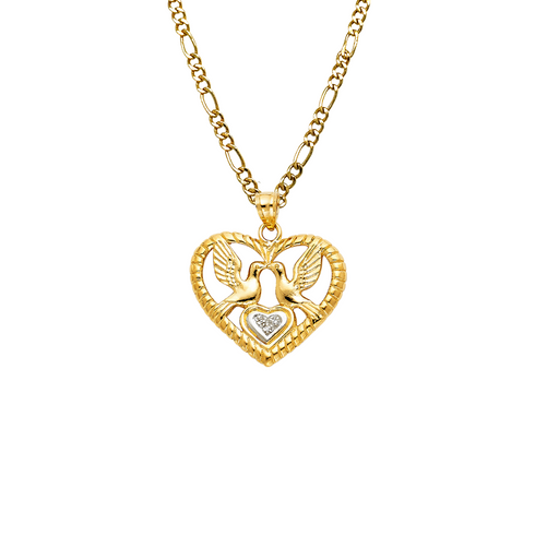 View full details14k Lovebirds Gemstone Heart Pendant and choice of Solid Figaro or Valentino Chain Product Details: Guaranteed 14 Karat Solid Gold Pendant and So...