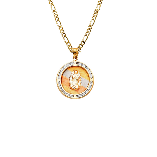 14k Virgin Mary Round Gold Pendant with Gemstones and choice of Solid Figaro or Valentino Chain