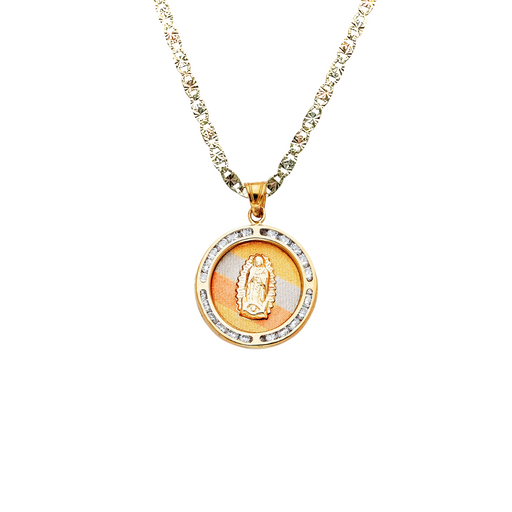 14k Virgin Mary Gold Pendant Round with Gemstones and Solid Chain - LE-187