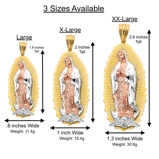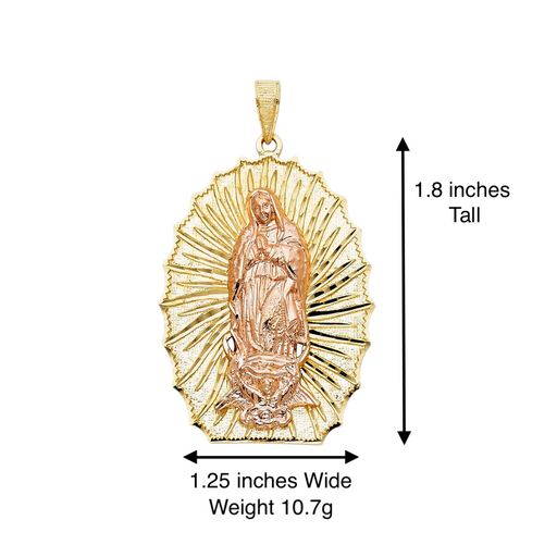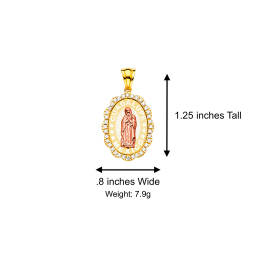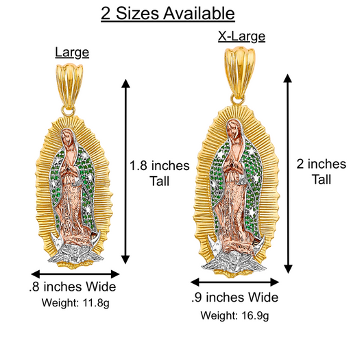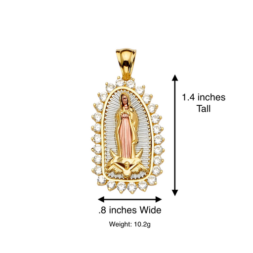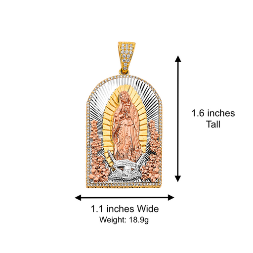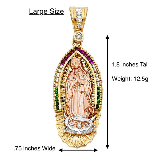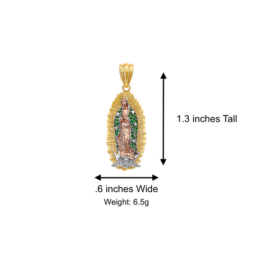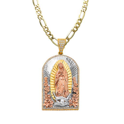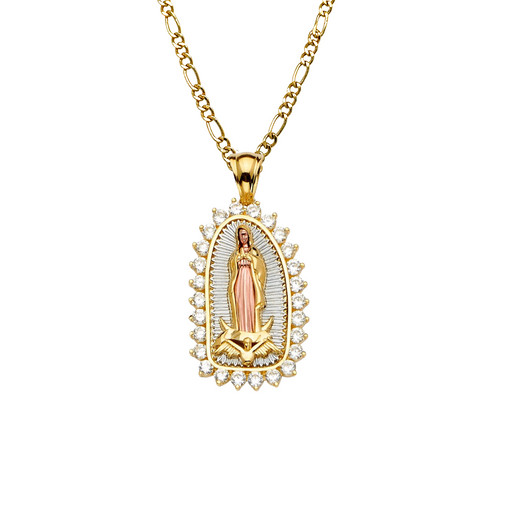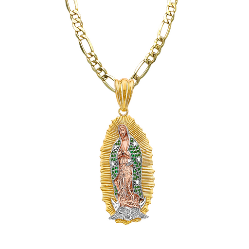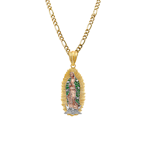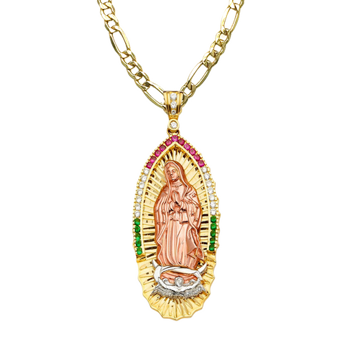View full details14k Gold Guadalupe Mexico Virgin Mary Pendant with White Gemstones and Solid Figaro Chain Product Details: Guaranteed 14 Karat Solid Gold Pendant...
