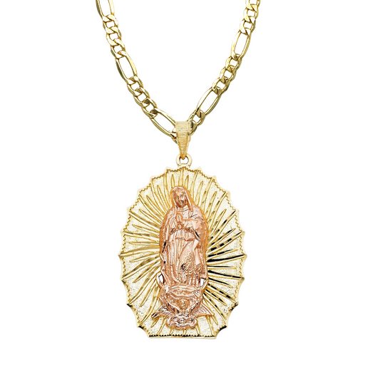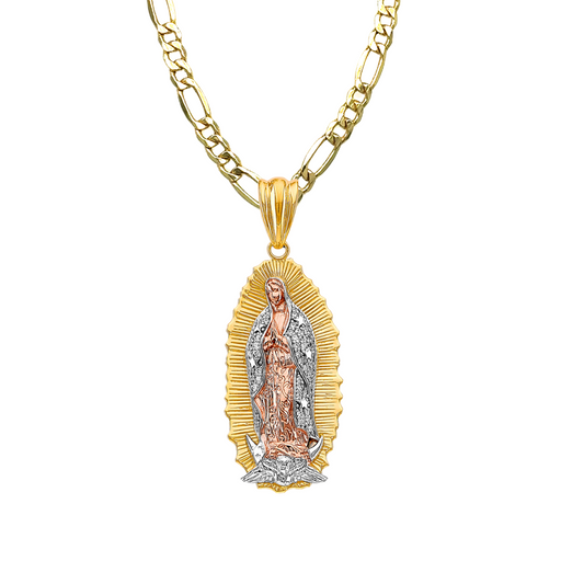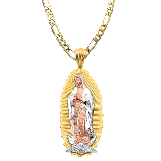 View full details14k Virgin Mary TriColor Diamond Cut Round Pendant with Solid Figaro Chain Product Details: Guaranteed 14 Karat Solid Gold Pendant and Solid Figa...