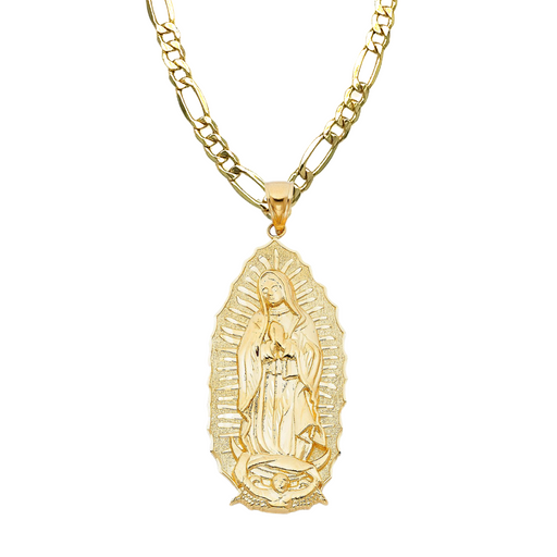 View full details14k Large Virgin Mary Pendant All Yellow with Solid Figaro Chain Product Details: Guaranteed 14 Karat Solid Gold Pendant and Solid Figaro Necklac...