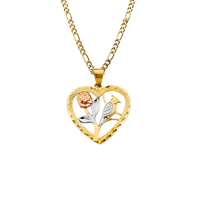 14k Bird and Flower Heart Tri-tone Gold Pendant and choice of Solid Figaro or Valentino Chain