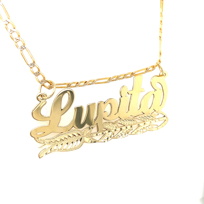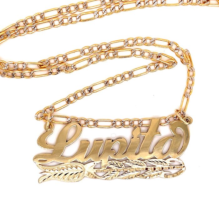 - Guaranteed 14Karat Solid Gold Nameplate and 14k Solid Diamond Cut Figaro Necklace