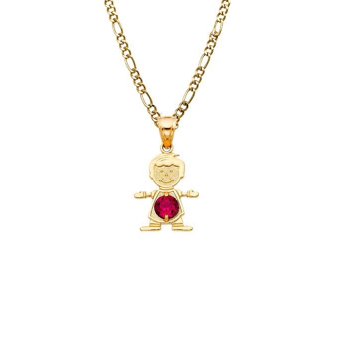 14k Gold July Month Niño Boy Son Birthstone Gemstone Pendant with choice of Solid Figaro or Valentino Chain