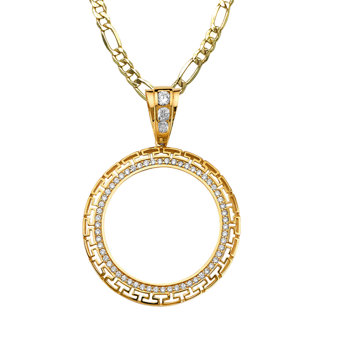 14k Gold Centenario Greek Design Gemstone Bezel with Solid Figaro Chain - LE-2753