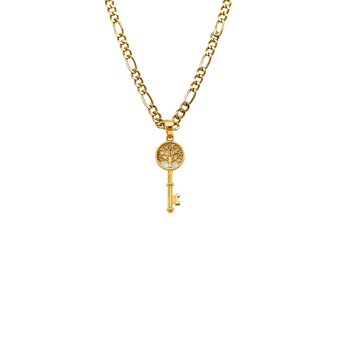14k Gold Family Tree of Life Key Pendant and choice of Solid Figaro or Valentino Chain