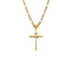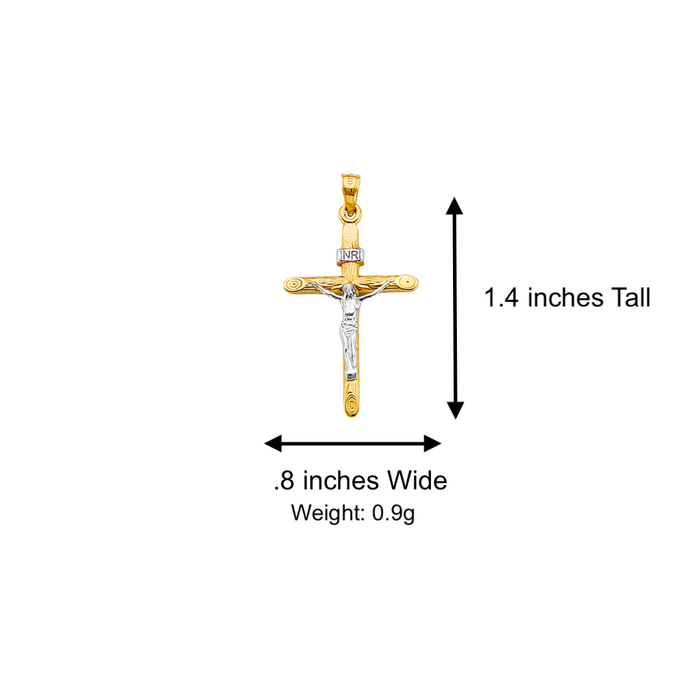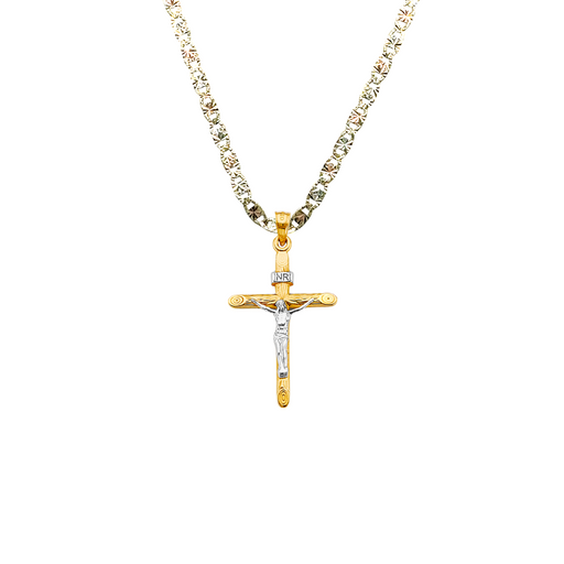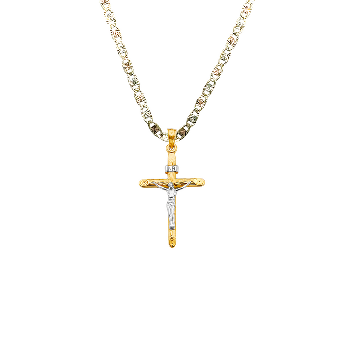 14k Two Tone Gold Wood Textured Jesus Cross Pendant with choice of Solid Figaro or Valentino Chain