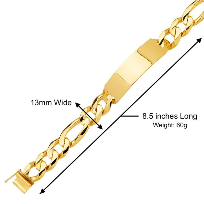 14k Gold Men's 13mm Solid Figaro Link ID Bracelet with Custom Gold Name Plate - LE-0742