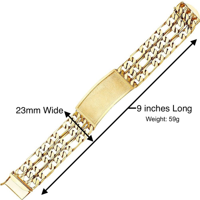 Looking for a statement piece that exudes both Strength and Sophistication? Our 14k Gold 3 Row Figaro 23mm Link Custom ID Bracelet is the embodiment of your distinct personality and individuality. Crafted for the modern man, this bracelet is more than just an accessory; it's a reflection of your unique identity.