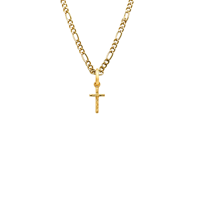 14k Gold All Yellow Tiny Jesus Cross Pendant with choice of Solid Figaro or Valentino Chain