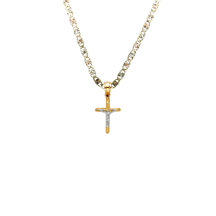 14k Gold Two Tone Tiny Jesus Cross Pendant with choice of Solid Figaro or Valentino Chain