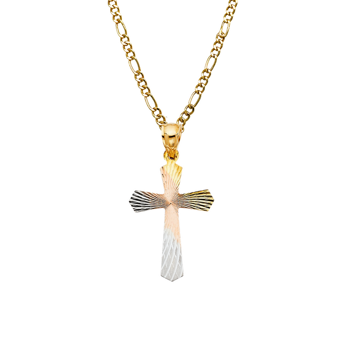 14k Gold Tri Tone Cross Pendant with choice of Solid Figaro or Valentino Chain