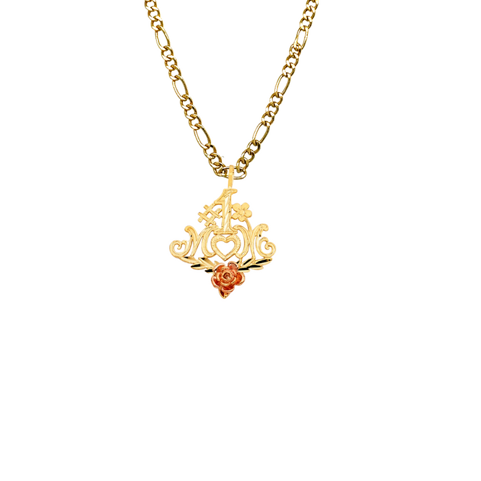 14k Gold Two Tone #1 Mom Heart Pendant and choice of Solid Figaro or Valentino Chain
