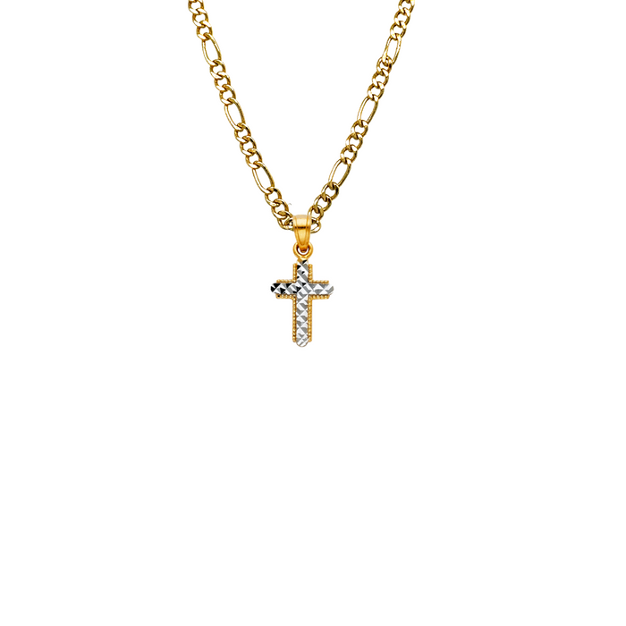 14k Gold Small Two Tone Cross Pendant with choice of Solid Figaro or Valentino Chain