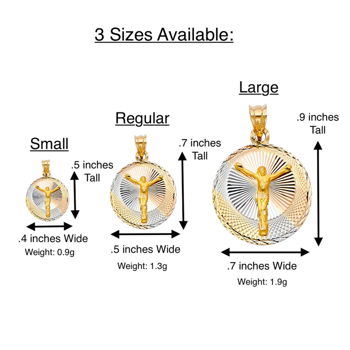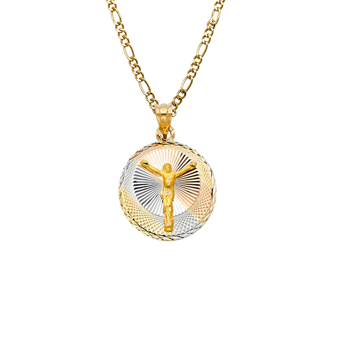 14k Jesus Christ TriColor Gold Round Pendant with choice of Solid Figaro or Valentino Chain