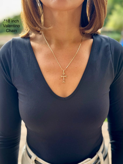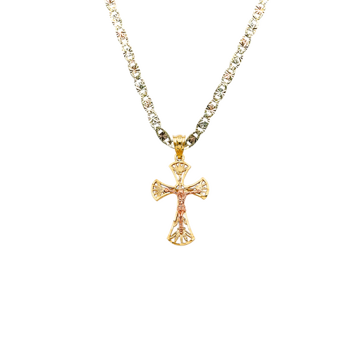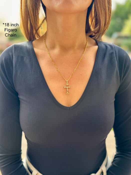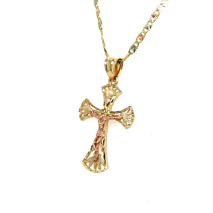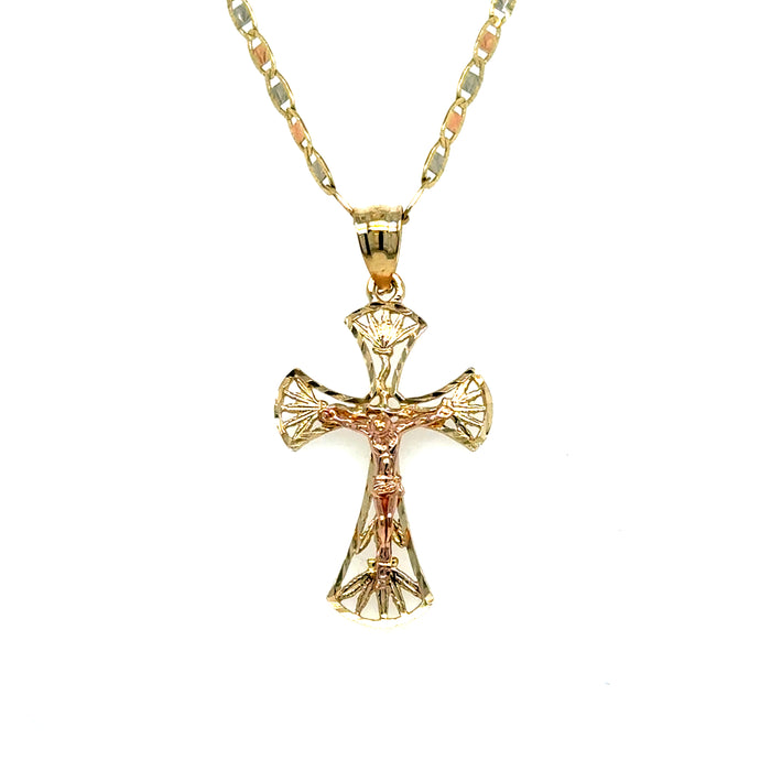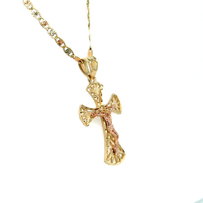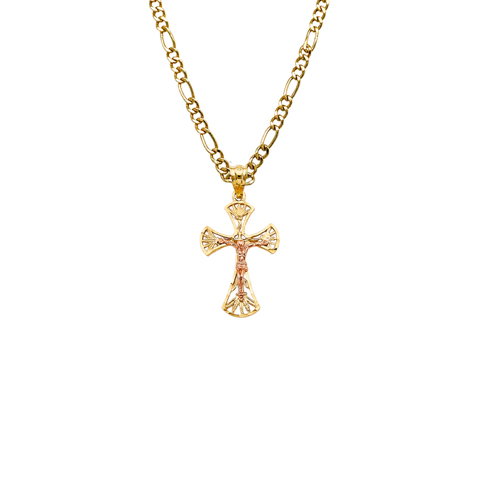 14k Rose Gold Jesus Cross Pendant with choice of Solid Figaro or Valentino Chain