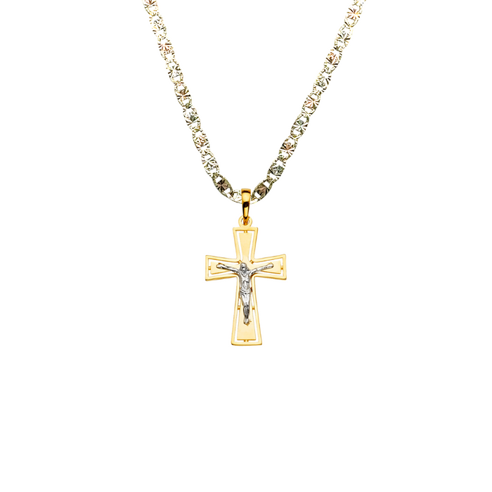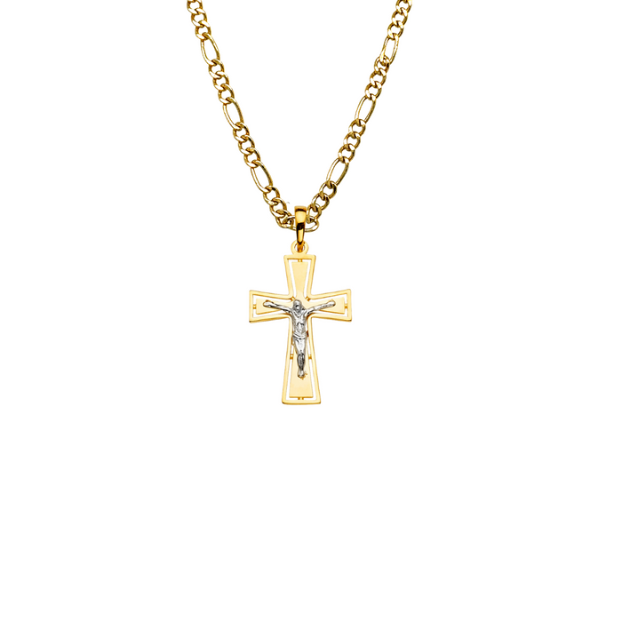 14k Two Tone Gold Jesus Cross Pendant with choice of Solid Figaro or Valentino Chain