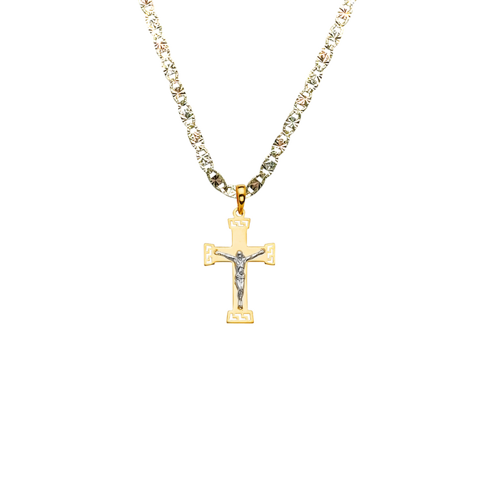 14k Two Tone Gold Jesus Cross Pendant with choice of Solid Figaro or Valentino Chain