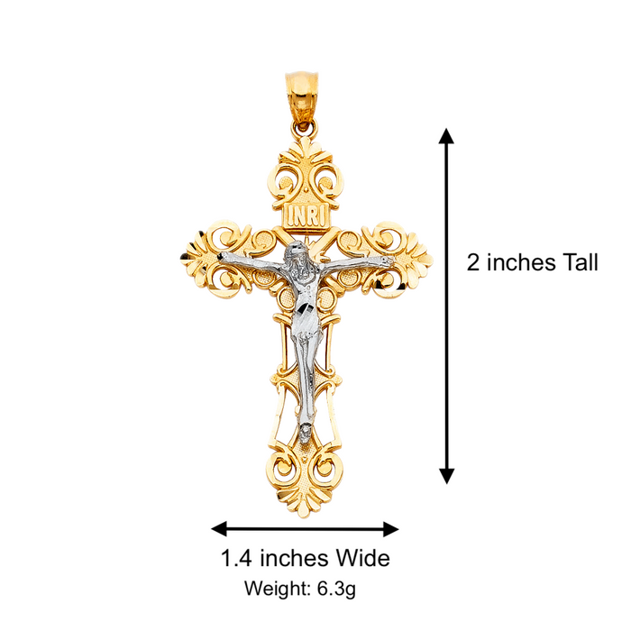 14k Two Tone Gold Ornate Jesus Cross with Solid Figaro Chain