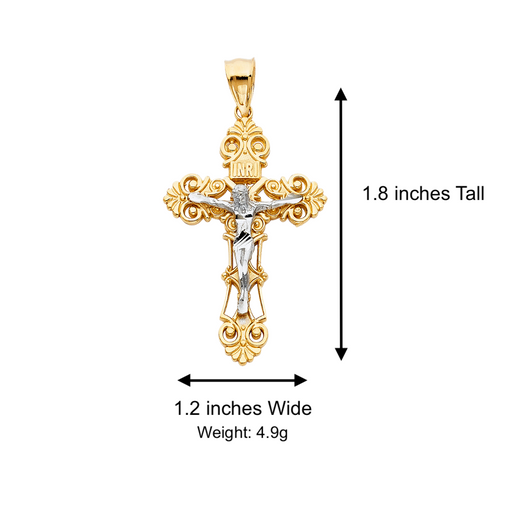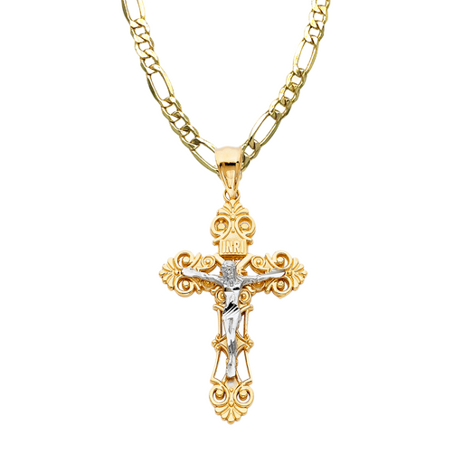 14k Two Tone Gold Ornate Jesus Cross with Solid Figaro Chain