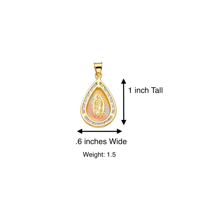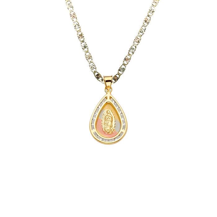 14k Virgin Mary Tear Drop Gold Pendant with Gemstones and choice of Solid Figaro or Valentino Chain