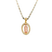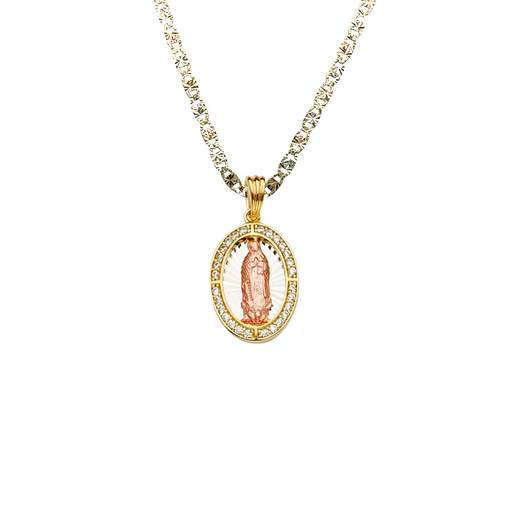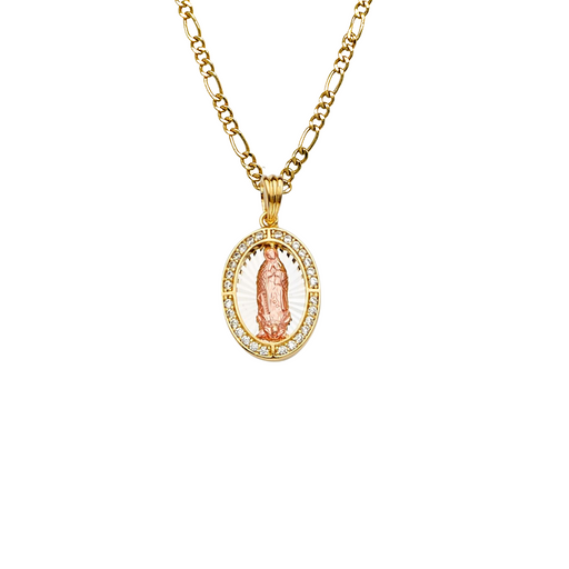 14k Virgin Mary Oval Pendant with Gemstone Bezel and choice of Solid Figaro or Valentino Chain
