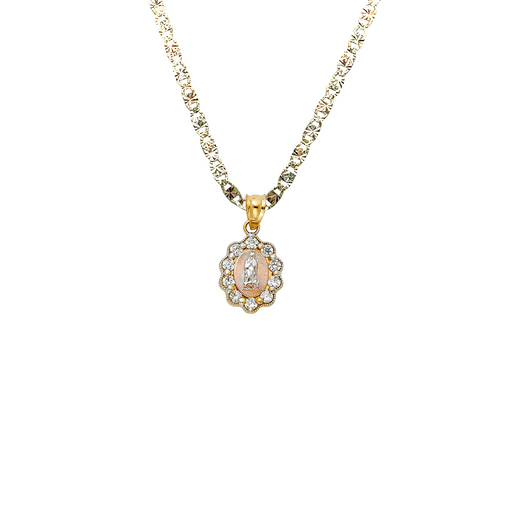 14k Virgin Mary Pendant with Gemstone Wreath Bezel and choice of Solid Figaro or Valentino Chain