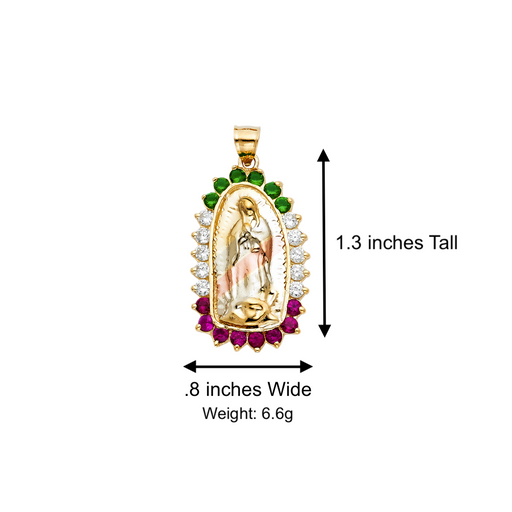 14k Virgin Mary Pendant with White Red Green Gemstone Bezel and Solid Figaro Chain - LE-1073