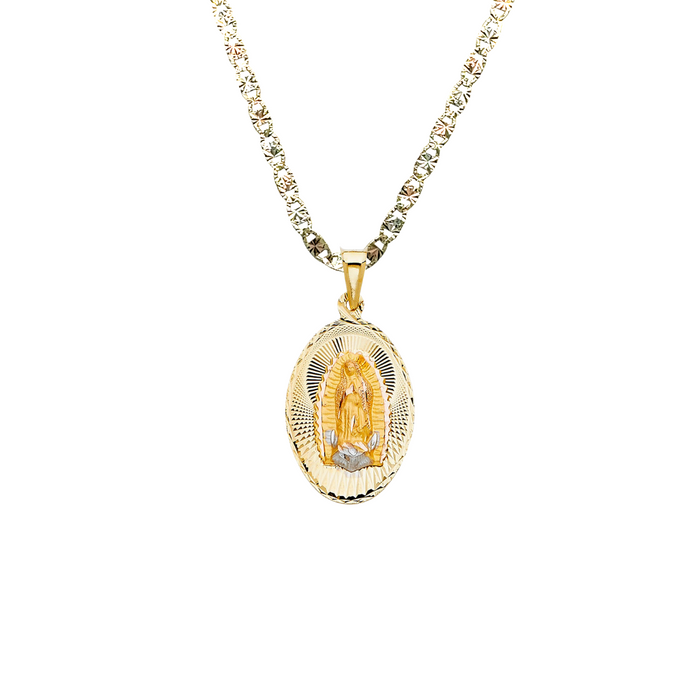 14k Yellow Gold Virgin Mary Oval Pendant with choice of Solid Figaro or Valentino Chain